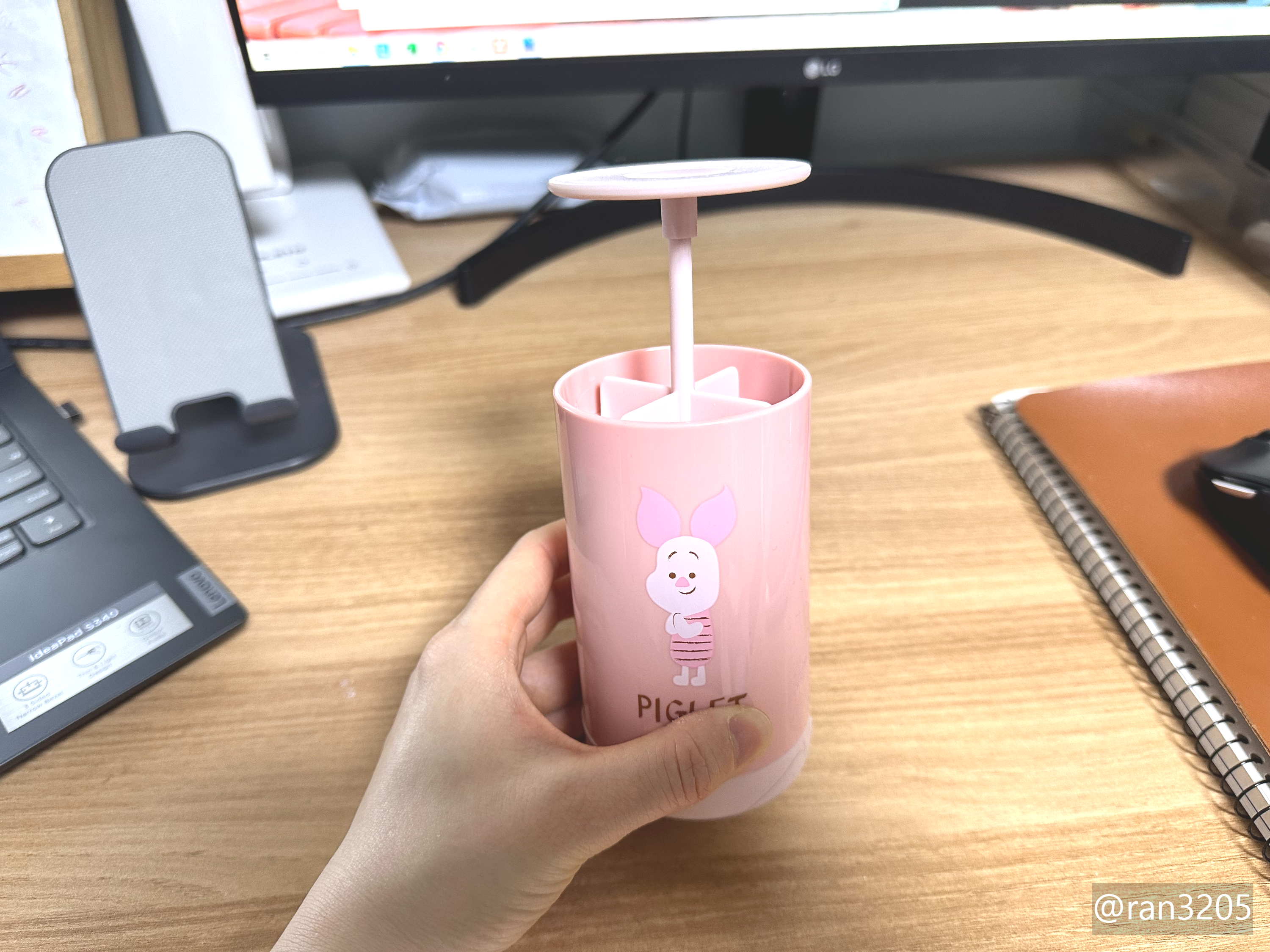 일단 뚜껑은 분리되지 않고, 내부에 칸이 4칸으로 구분 되어 있어 면봉을 넣을 때 조금 불편한 점이 있지만, 이 정도는 감수할 만하다. But, 저 뚜껑이 눌러서 열고 눌러서 닫는 타입인데, 원터치로 편리하게 사용하라고 되어 있지만 내부에 스프링이 스무스하지 않고 매우 거슬리는 삐걱 소리를 내면서 열고 닫힌다는 점. 그 점 때문에 비추천 아이템으로 소개하게 되었다. 그래서 위의 투명 케이스로 대체하고 이 면봉 케이스는 피그렛 디자인이 귀여워서 그냥 장식용으로 전락했다는 이야기.