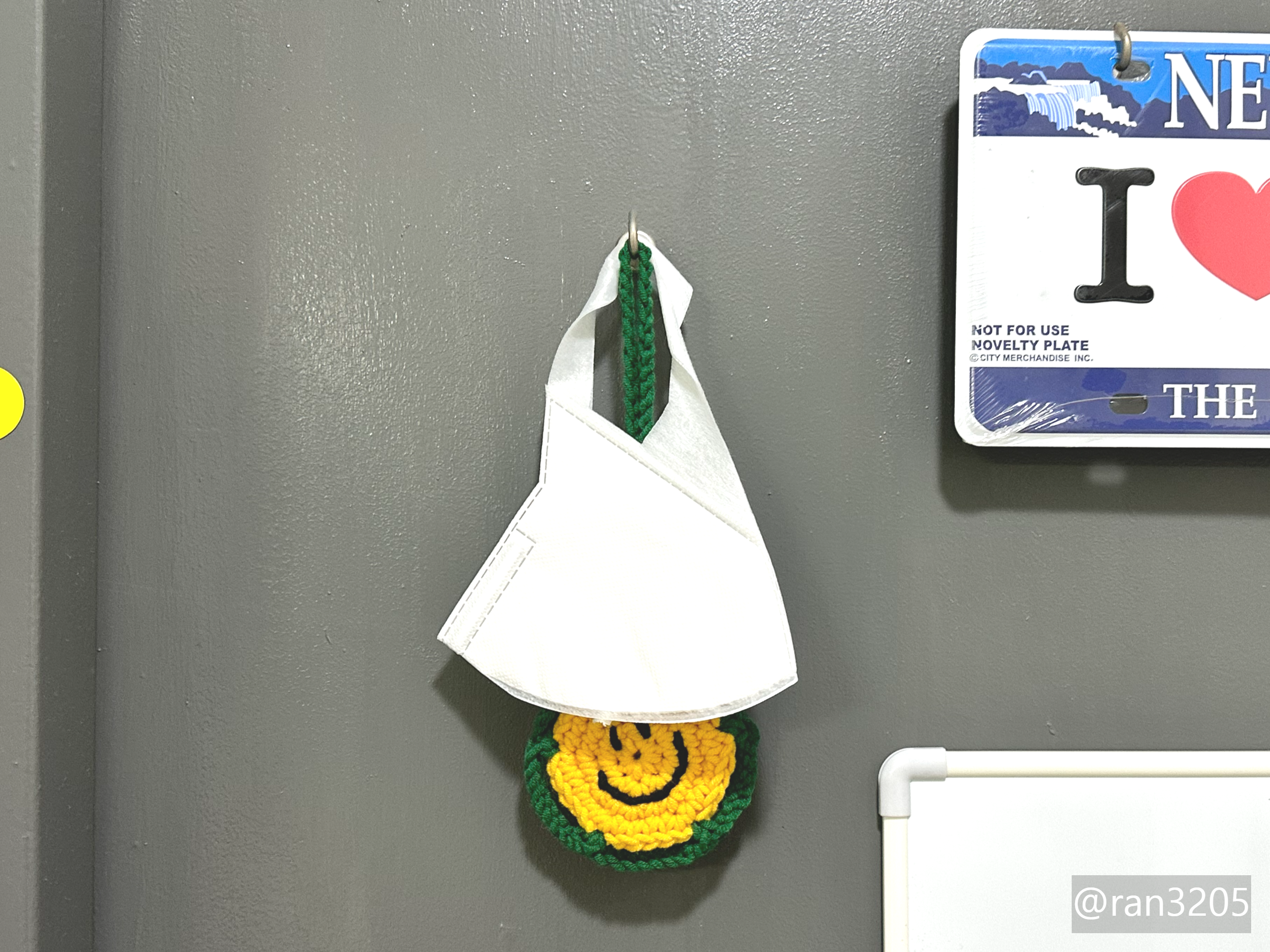 현관문에 부착해서 친구가 만들어준 백참을 걸어두었고, 항상 사용하는 마스크도 함께 걸어두니 편리하다.