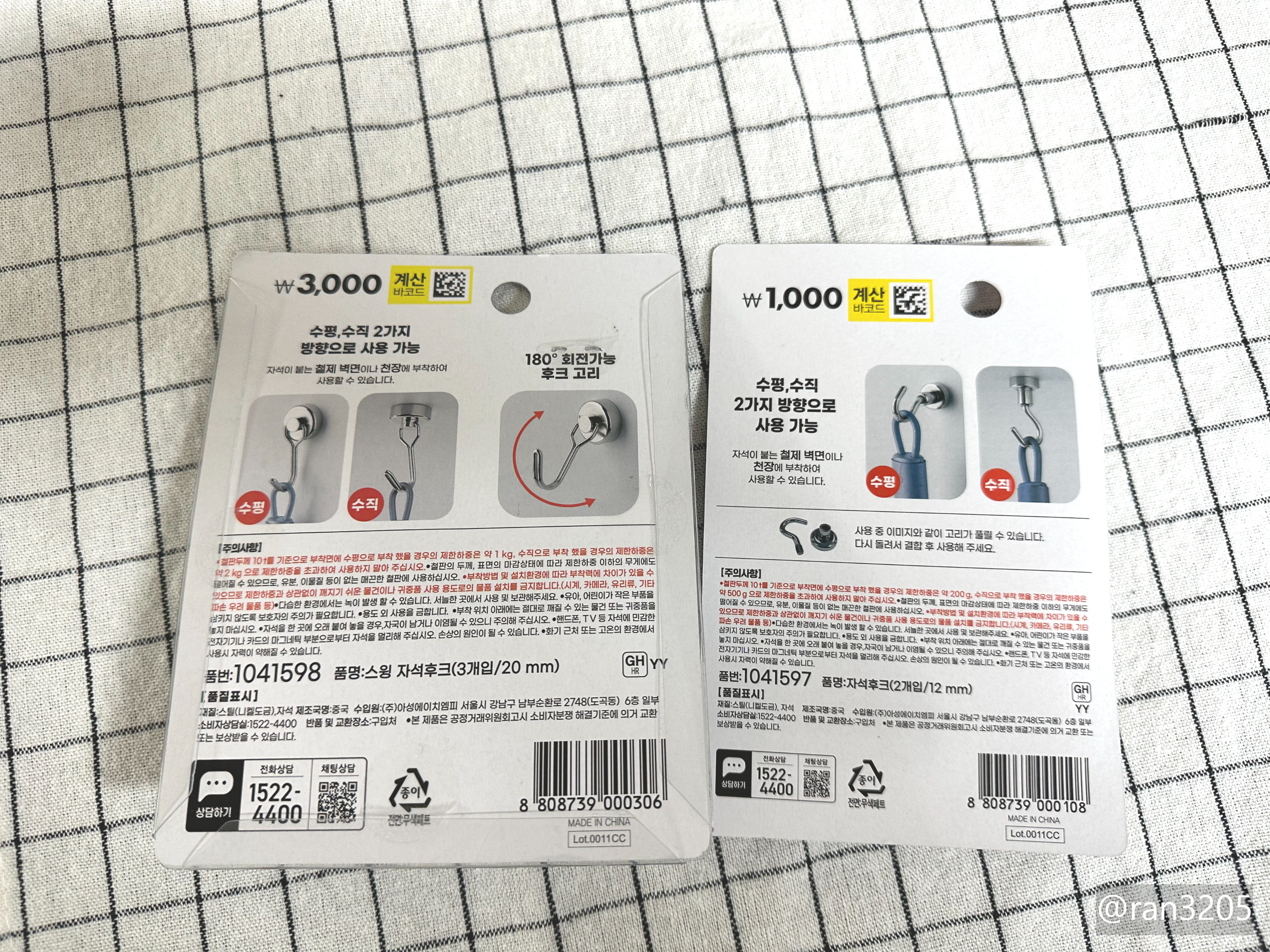다이소 가성비템으로 추천을 많이들 하는 자석 후크이다. 2가지 종류가 보여서 둘 다 집어왔는데, 가장 큰 차이점은 자석 크기와 후크 고리 모양이다. 3개입 타입이 아무래도 자석 크기가 더 크다 보니, 더 무거운 하중을 걸 수 있고, 2개입 타입은 좀 더 작아서 부피가 작은 반면, 비교적 가벼운 물건을 걸기에 적합하다. 그리고 두 가지 모두 수직, 수평 2가지 방향으로 사용이 가능하다고 되어 있지만, 3개입 타입은 180도 회전 후크 고리 모양이어서 수평으로 부착하였을 때, 후크 고리가 고정이 되어 있는 2개입 타입과 차이가 있다.