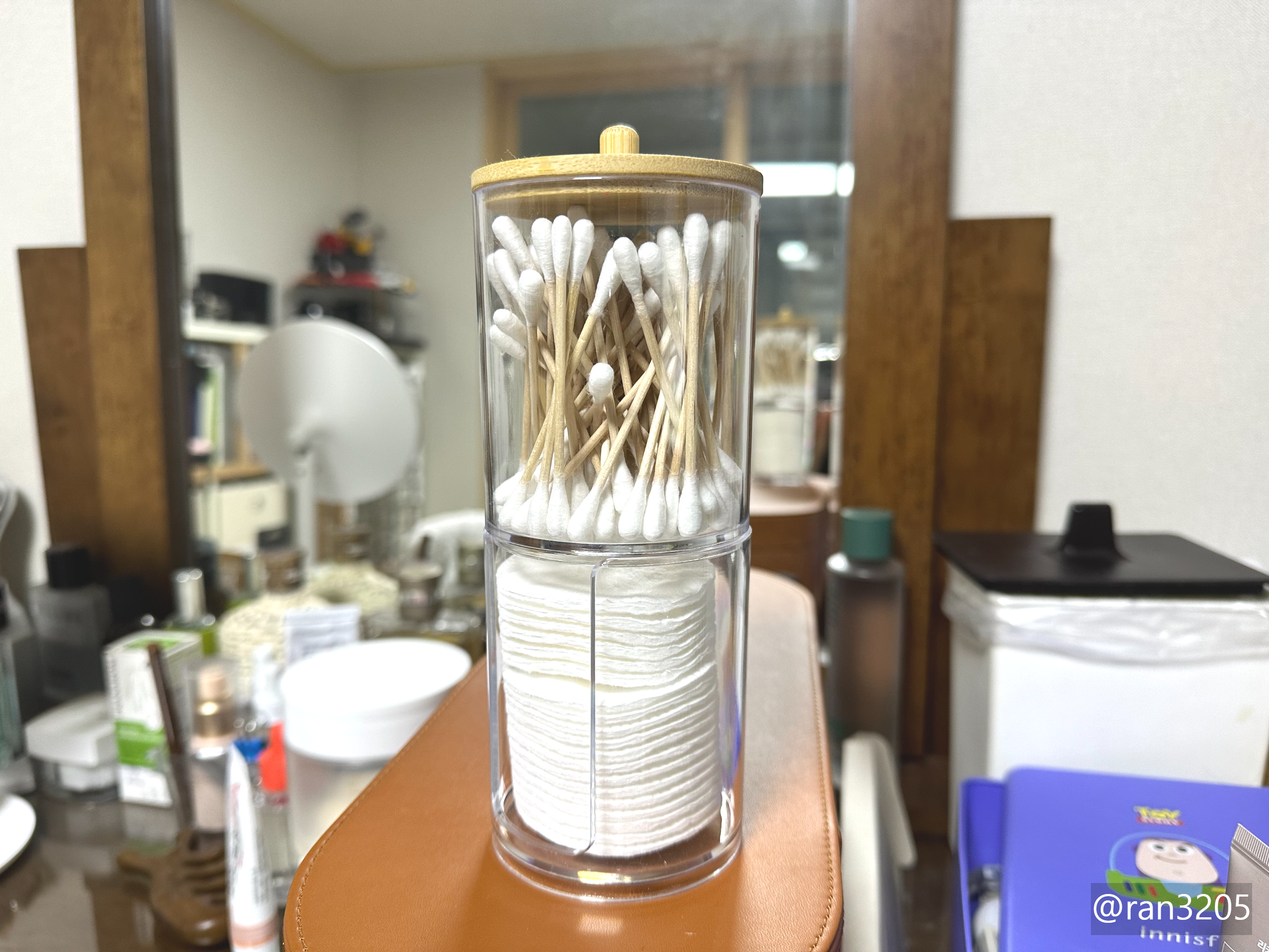 투명 케이스에 대나무 뚜껑이라 디자인 면에서도 깔끔하고 귀여워 보인다. 대나무 뚜껑은 거의 얹혀져 있는 형태라 거꾸로 뒤집으면 안 되지만, 여닫기 쉽다 보니 매일 면봉 사용할 때 쉽게 열어 쓸 수 있어서 장점으로 느껴졌다.