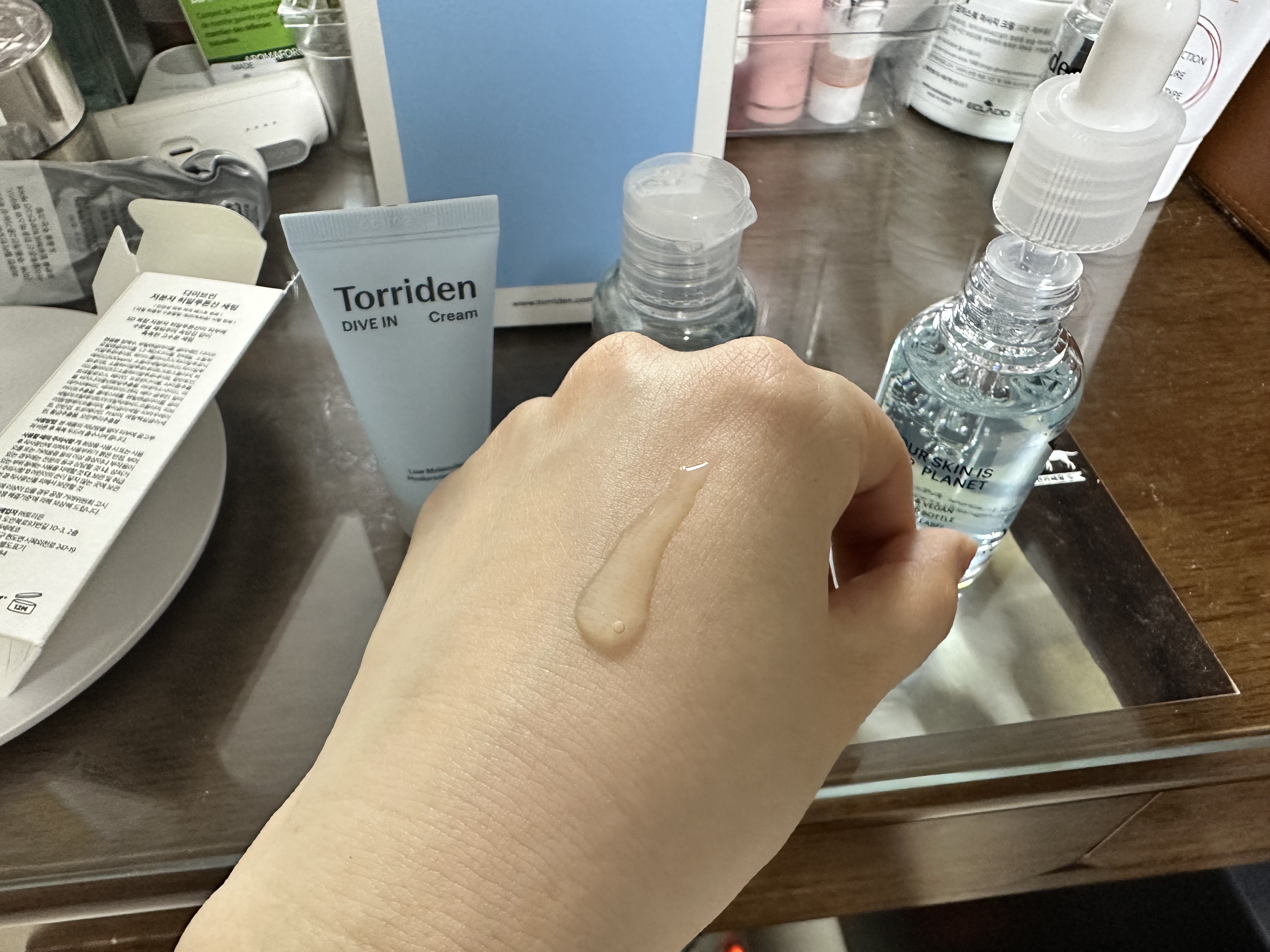 다른 히알루론산 제품을 사용했을때는 특유의 끈적함이 있는데, 다이브인 제품은 세럼도, 수딩 크림도 끈적임은 거의 느껴지지 않고 산뜻하게 흡수가 되는 느낌이 든다.