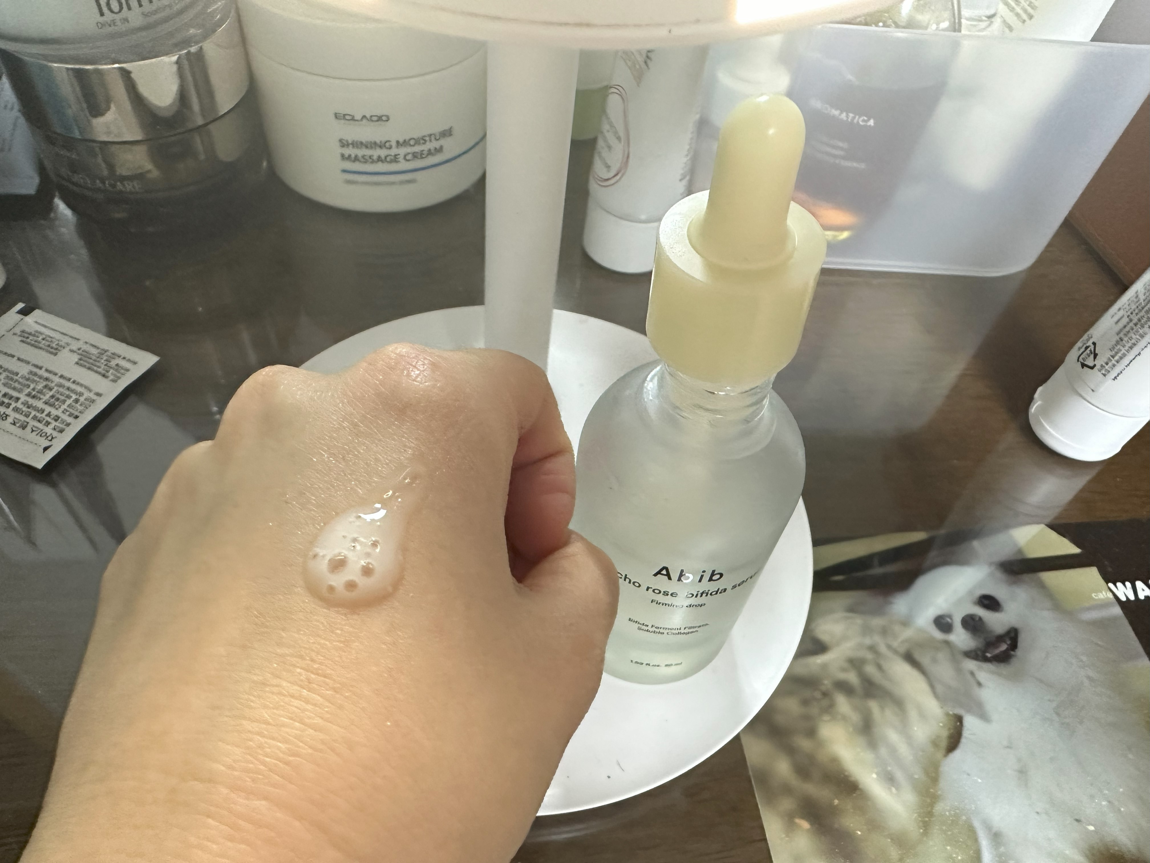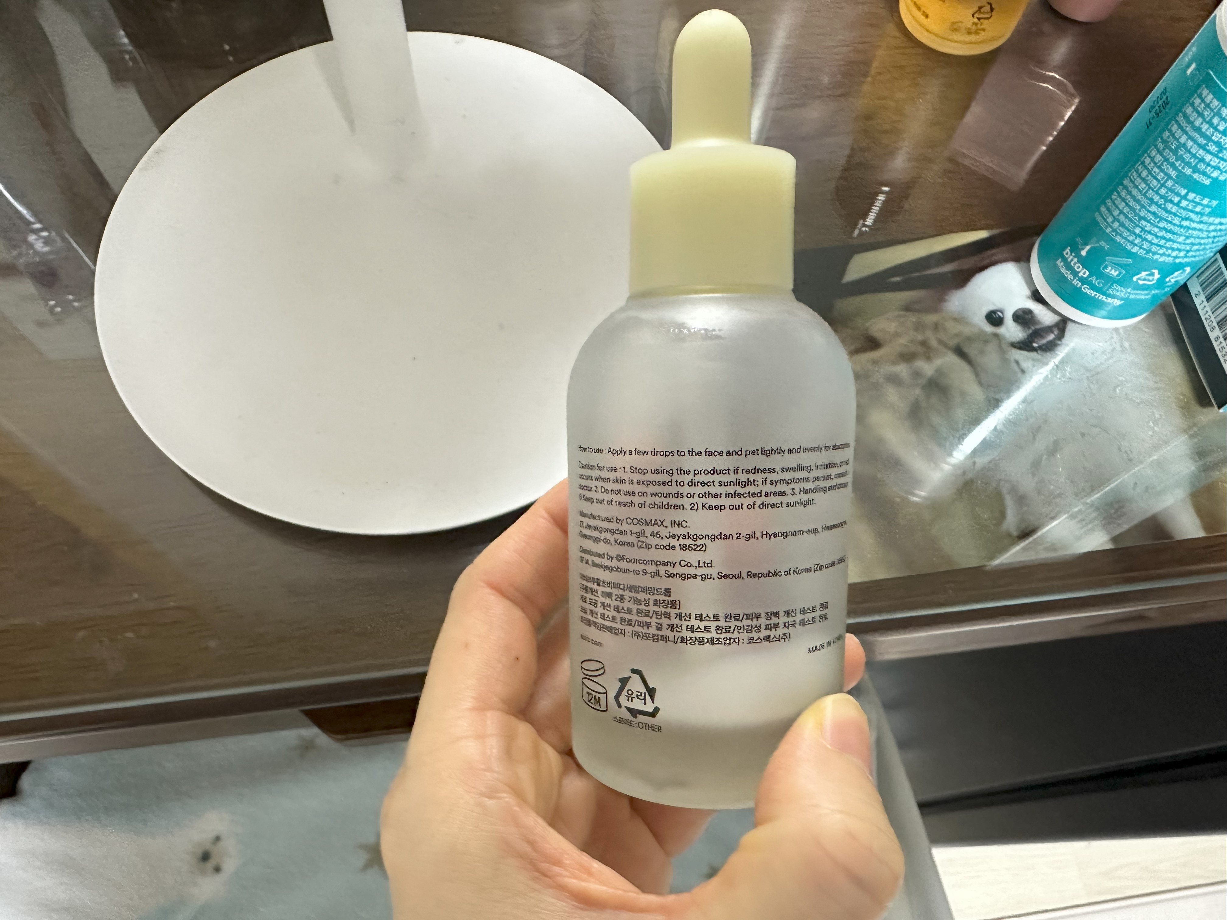 마지막 한 방울을 짜서 사용하는 모습이다. 용기는 거의 끝까지 사용할 수 있었고, 약간의 점성이 있지만 전혀 끈적이거나 무거운 느낌이 없이 순하게 흡수되는 느낌이어서 좋았다. 부드럽게 펴 발리는데 가볍지도 무겁지도 않은 딱 적당한 느낌이어서 건조하지 않으면서 영양감도 느낄 수 있어서 여러 피부 타입에도 쓰기 좋은 세럼이라는 생각이 든다.