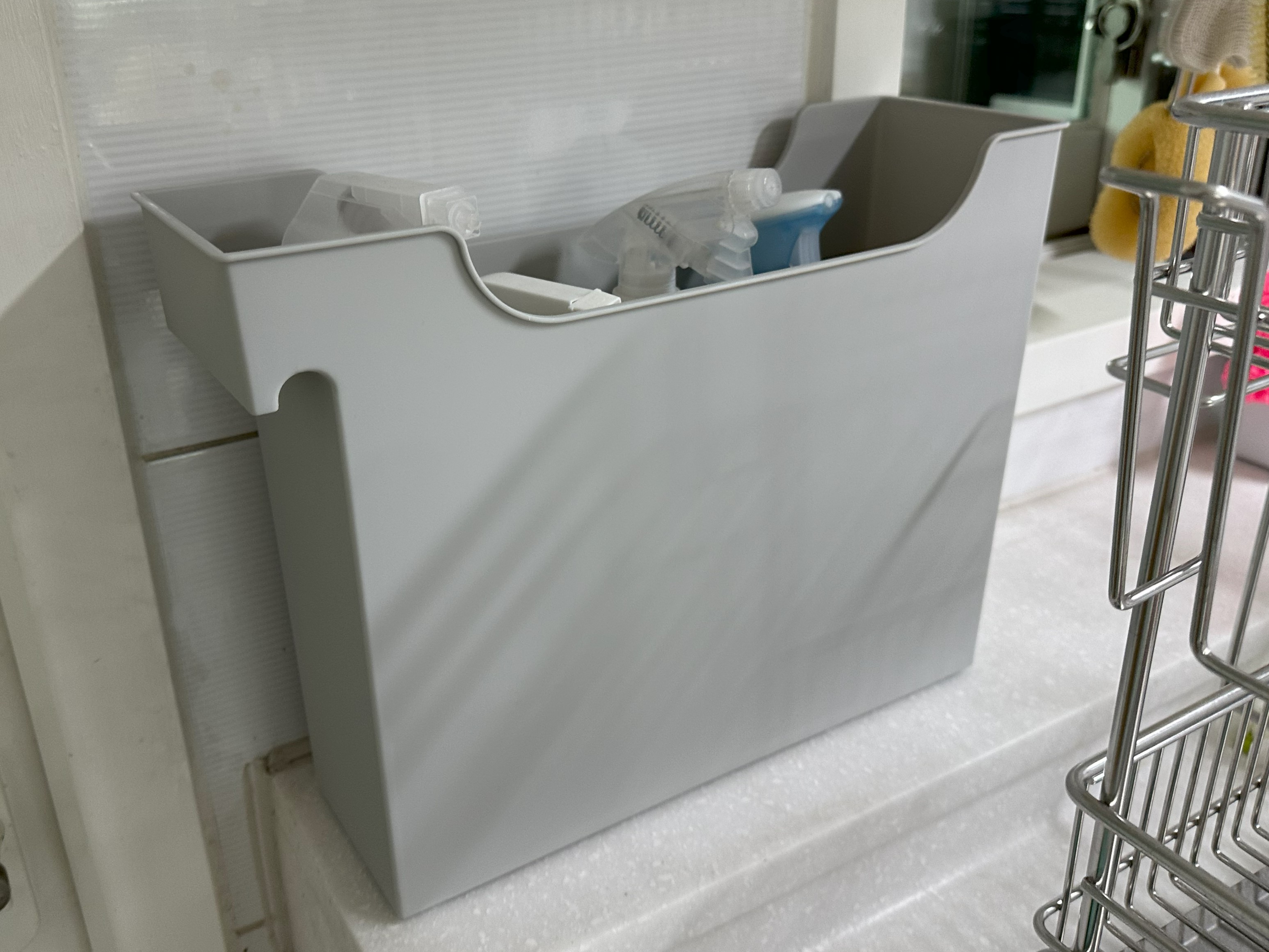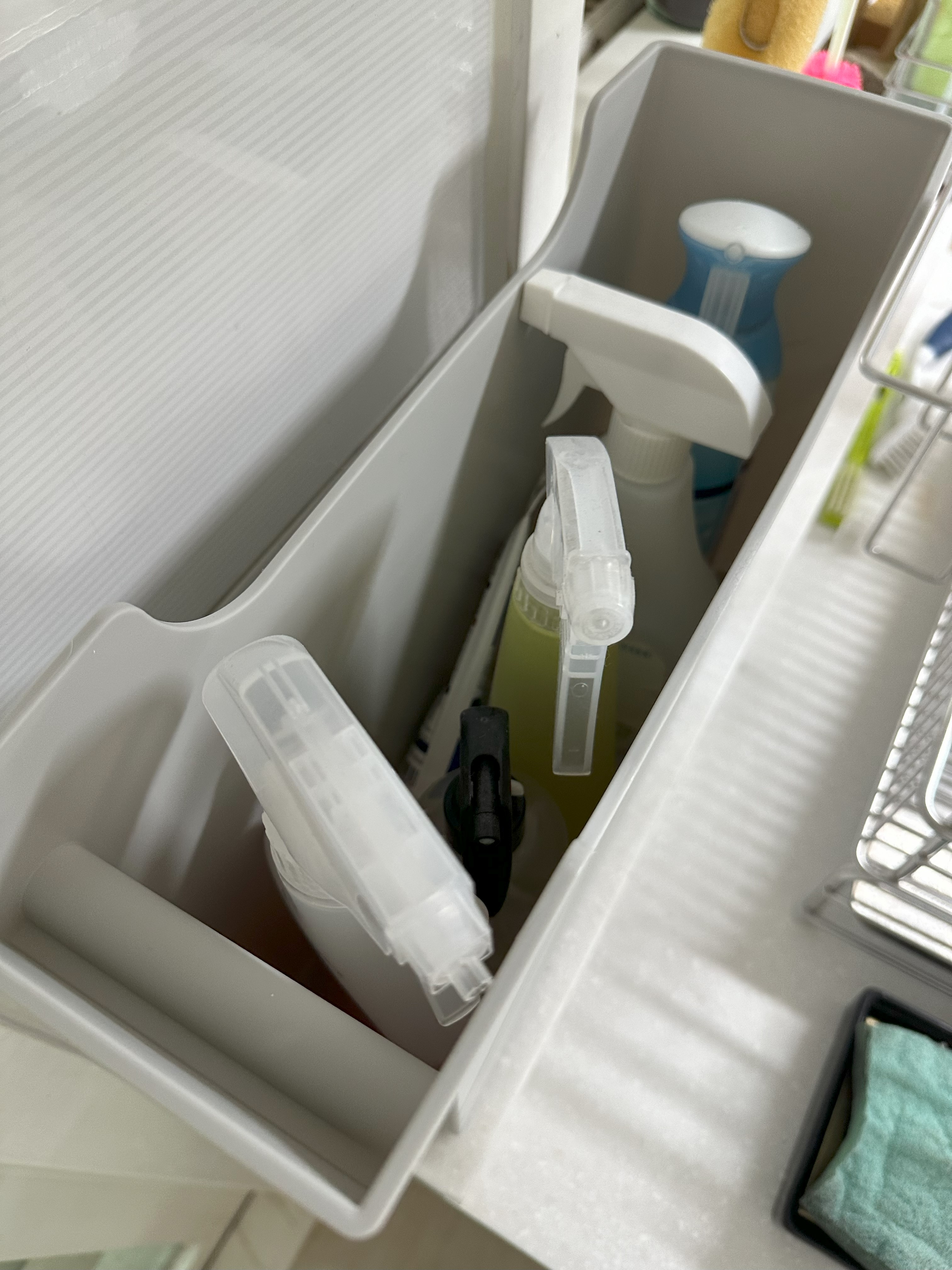 사실 내가 폭이 좁고 깊이감이 있는 바구니가 필요했던 이유는 바로 싱크대 위 식기 건조대 뒷공간에 널브러져 있는 스프레이형 세제들을 정리하고 싶어서였다. 사실 분무기들이 보기에 안 좋아서 다용도실에 두고 꺼내서 썼는데, 자주 사용하다 보니 다용도실에 가지러 갔다가 사용하고 나서 다시 두는 과정이 귀찮아서 점점 더 저 공간에 쌓이게 되었다. (귀차니즘...)