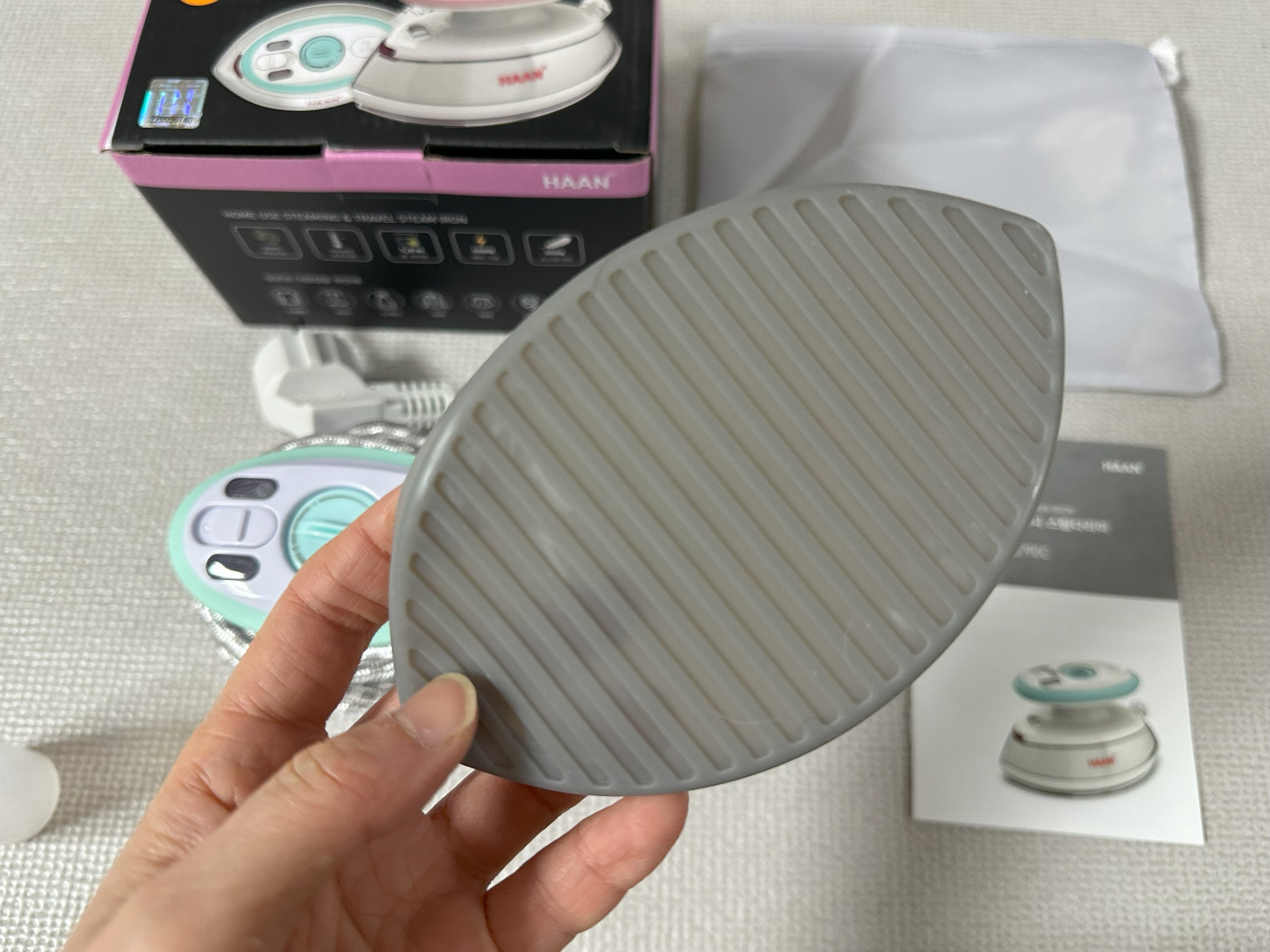 이 다리미는 수직으로 세울 수 없는 디자인이라서 사용 시에도 바닥에 둬야 하기 때문에 이 실리콘 패드가 있어서 유용하다. (아래 사진 참조)