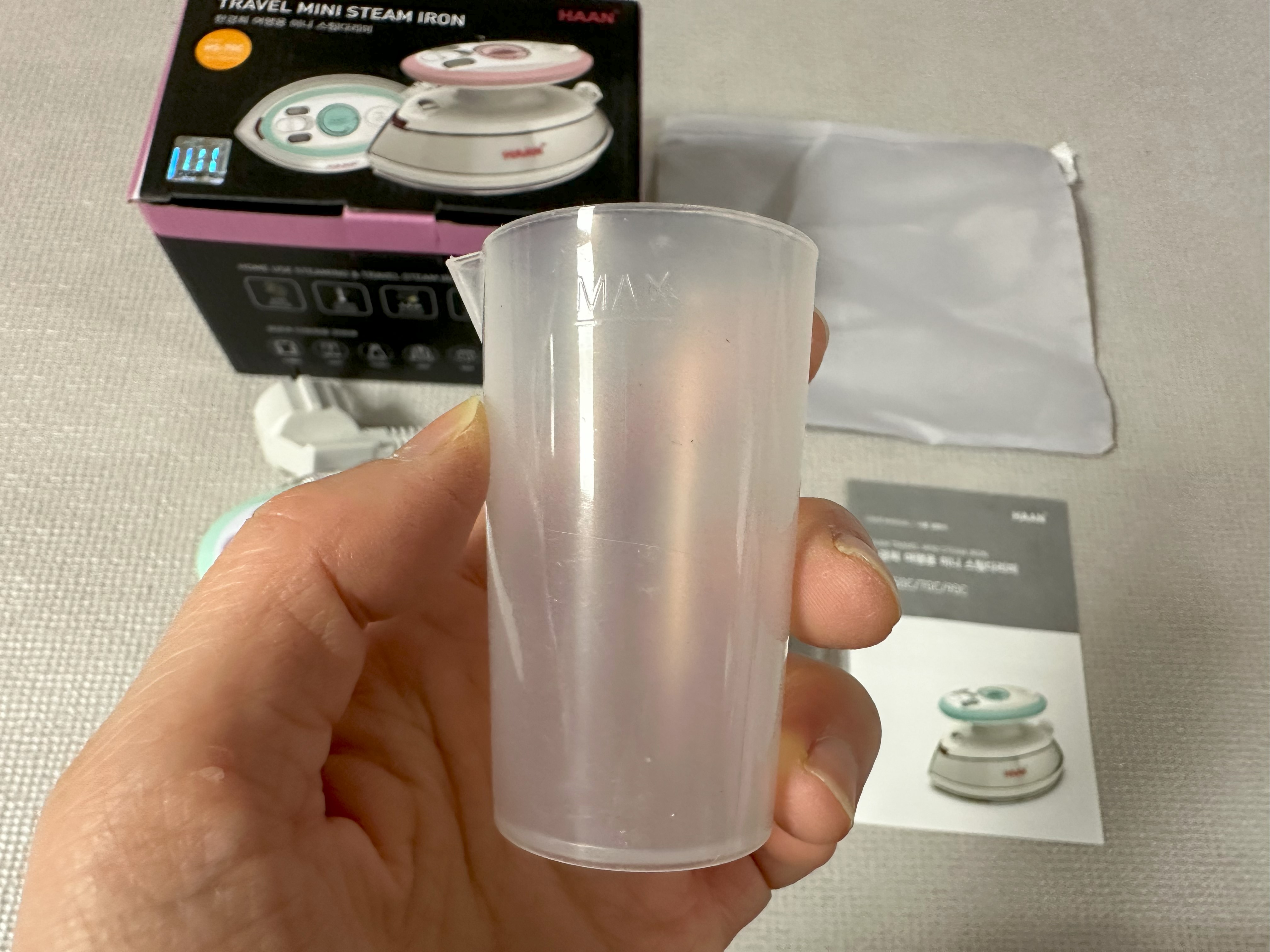 구성품인 이 물컵을 이용해서 실리콘캡을 들면 보이는 구멍에다가 물을 쪼르륵 부어주면 된다. 미니 다리미라 용량이 작기 때문에 물통도 조그맣다. 물통 용량은 50ml이다.