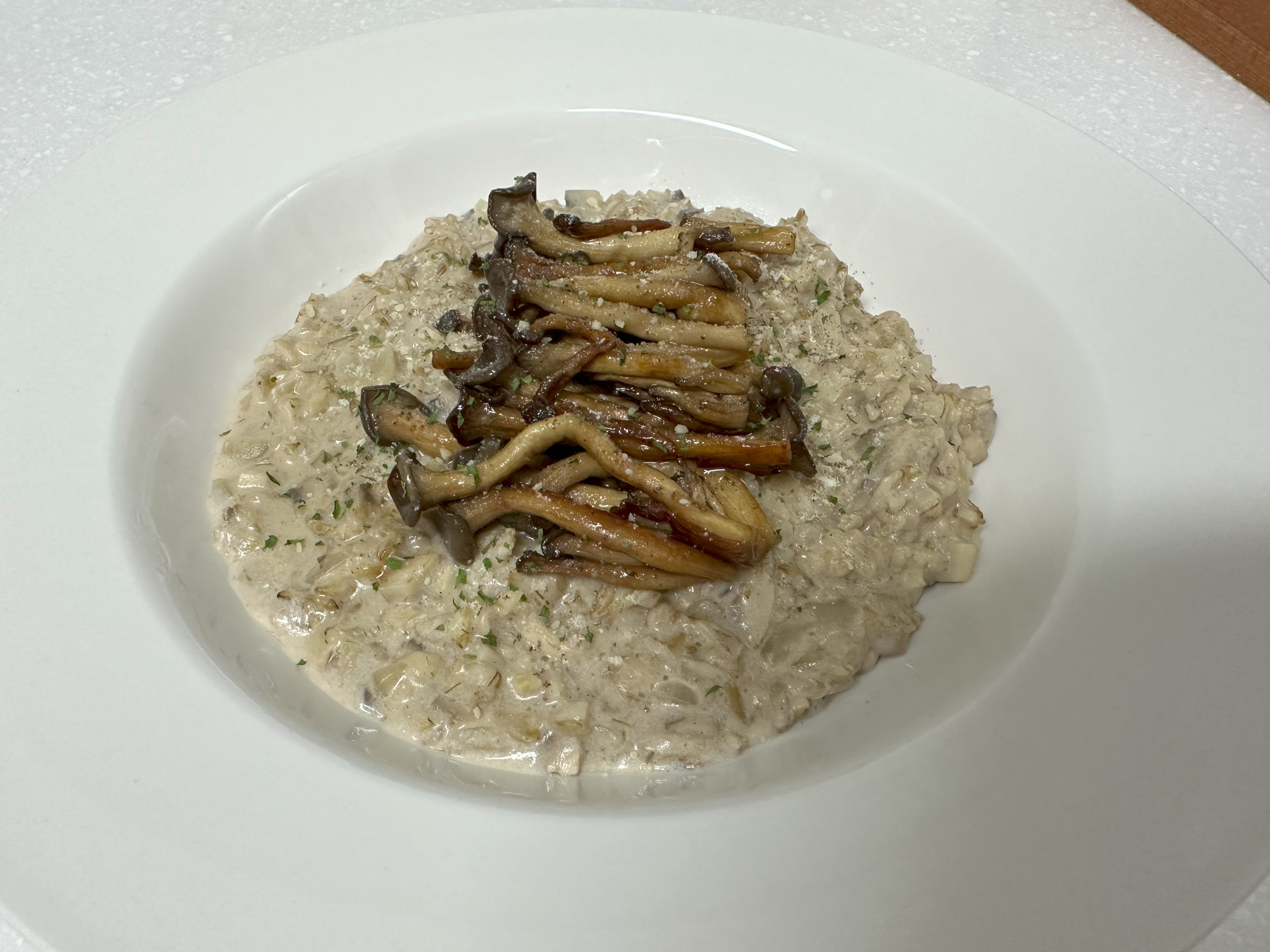 9. 접시에 리조또를 올리고 그 위에 버섯 고명과 파슬리 가루를 뿌리면 완성이다. (파슬리 가루는 생략 가능)