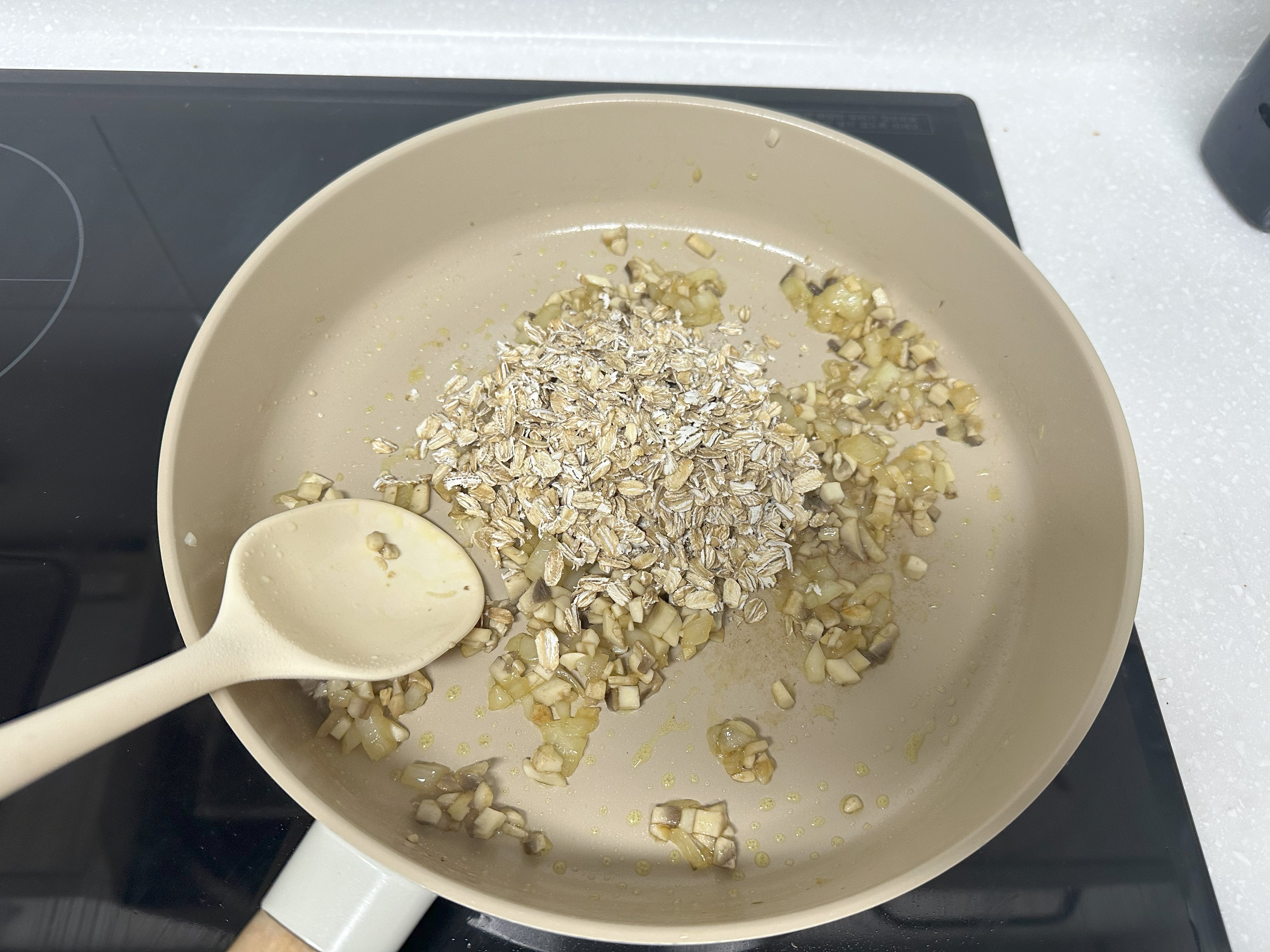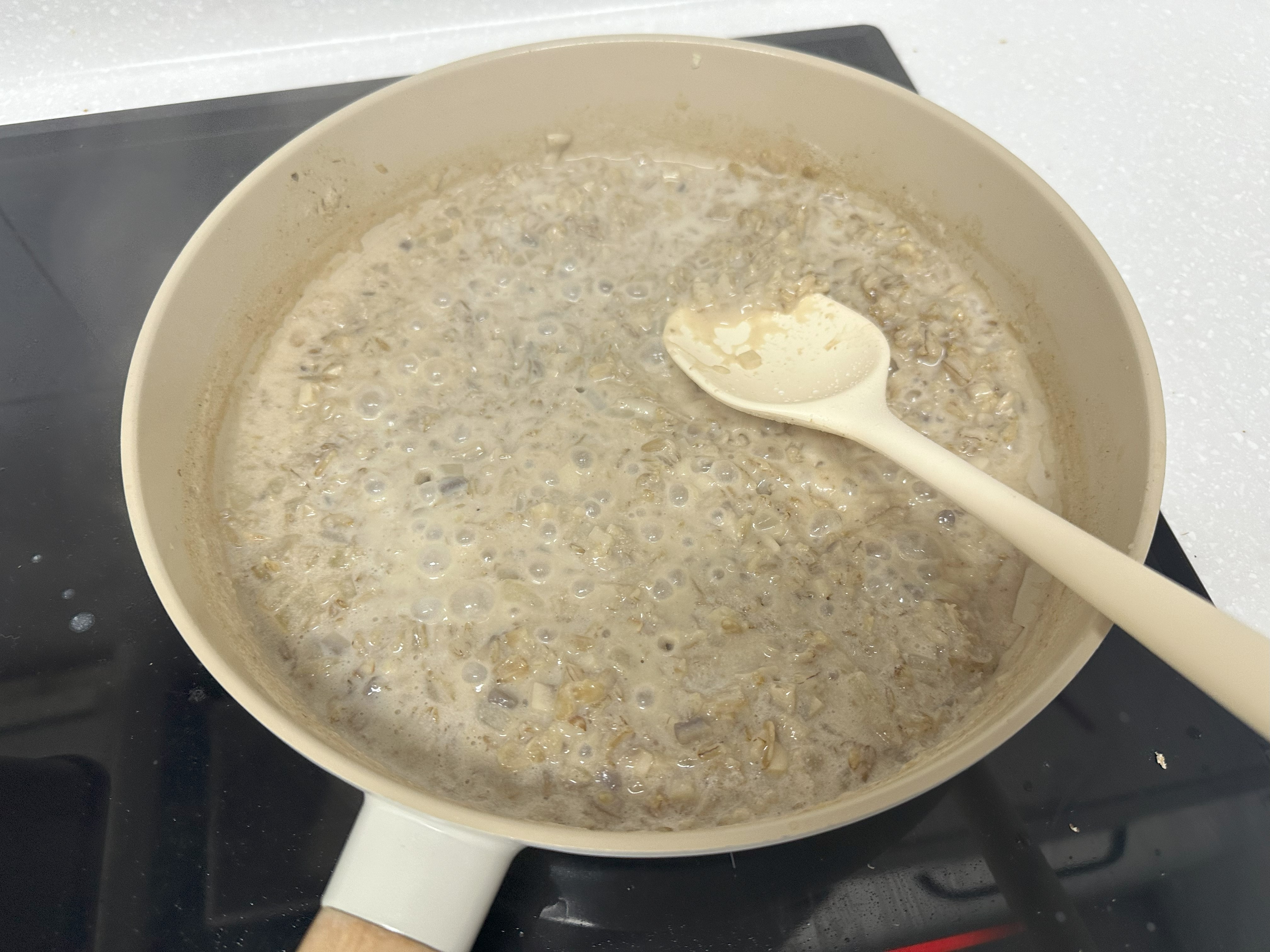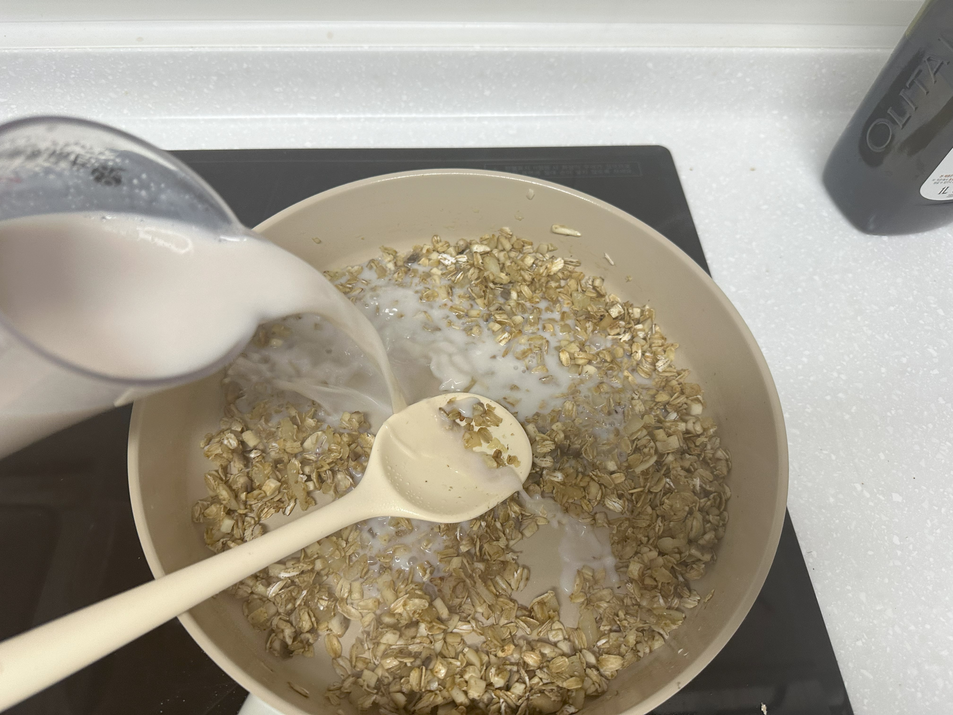 4. 양파가 투명해지면 오트밀을 넣고 함께 살짝 볶아주다가, 아몬드밀크 400ml를 넣어 중불에서 저어주면서 끓인다.