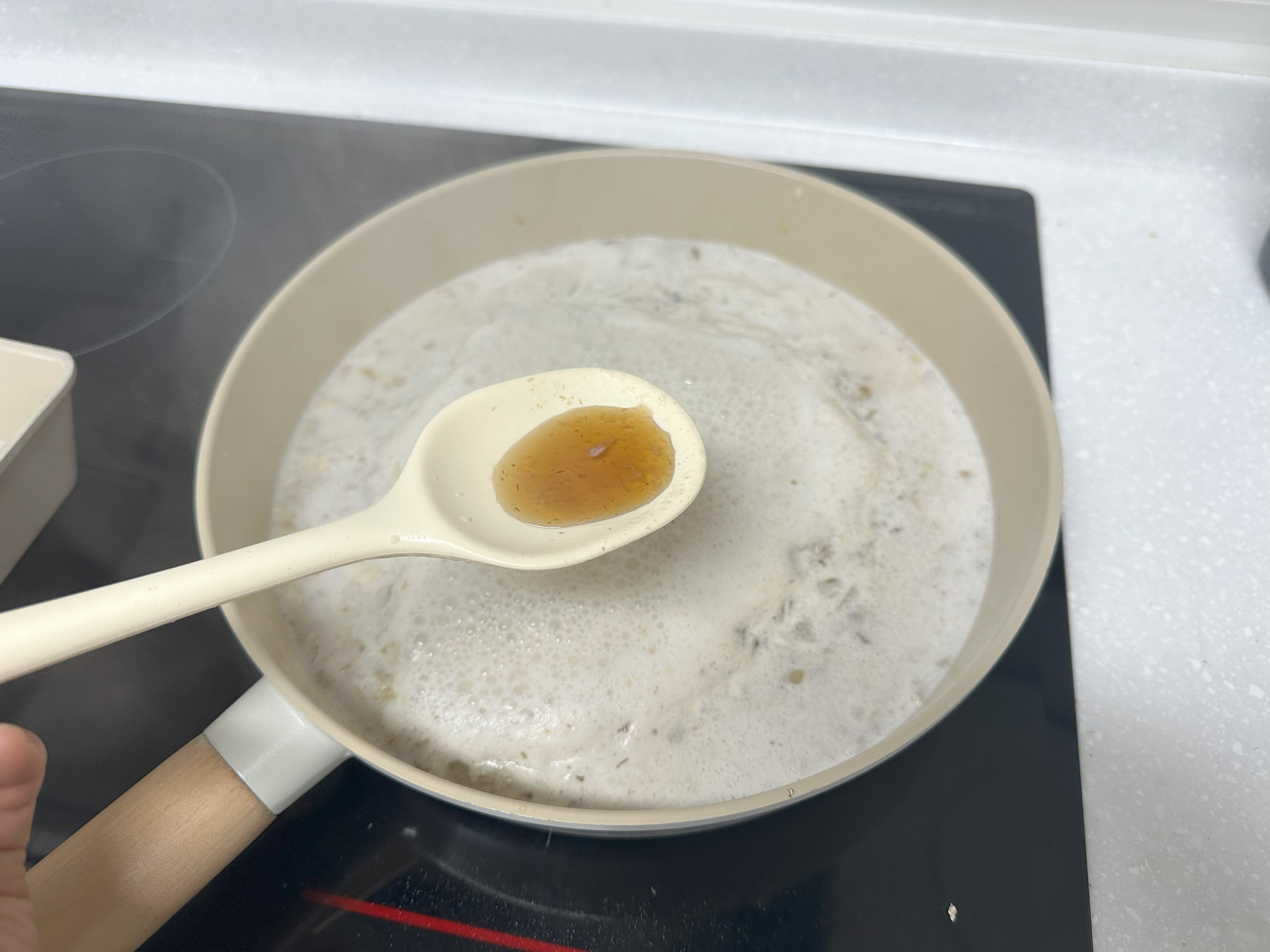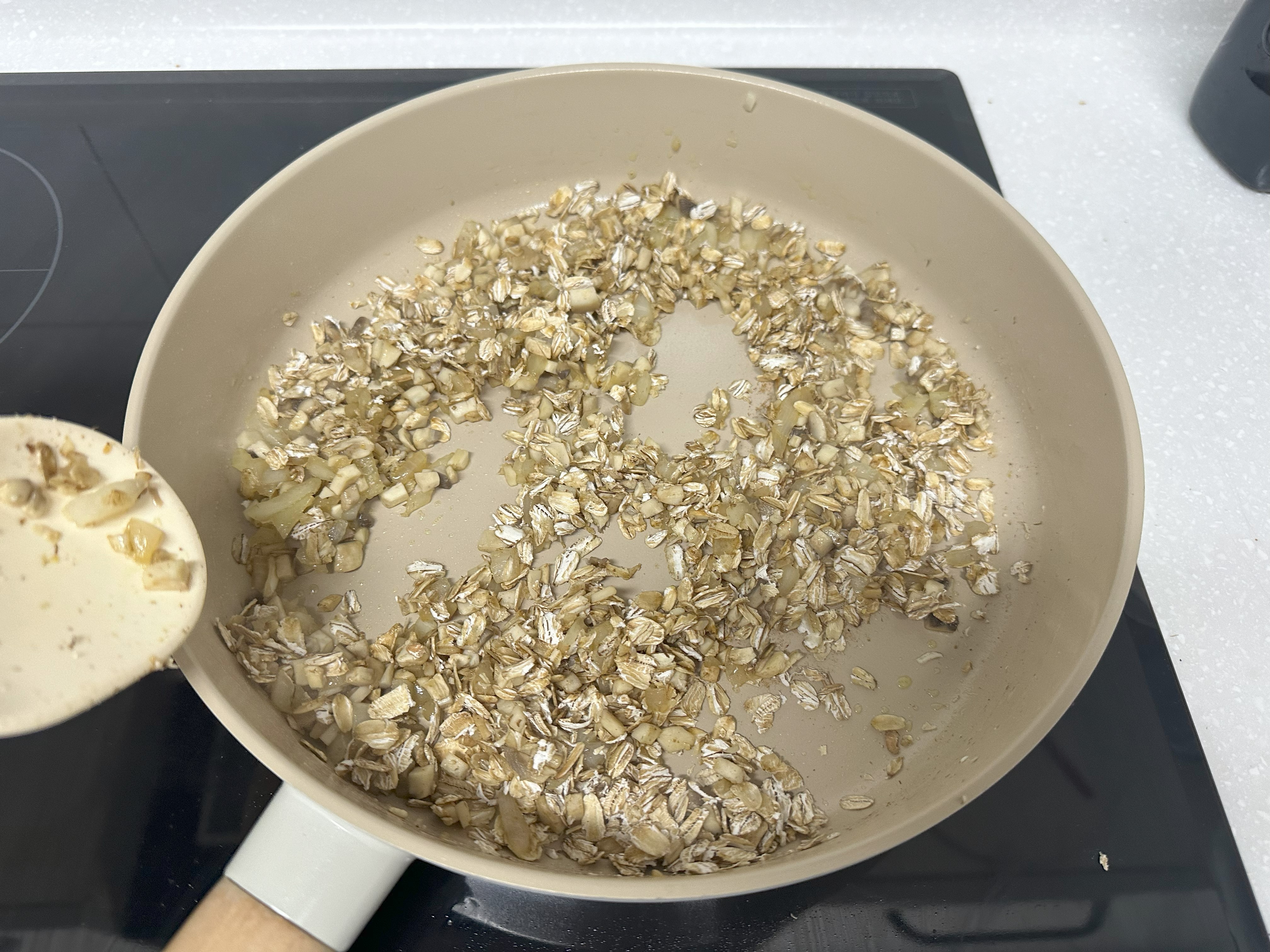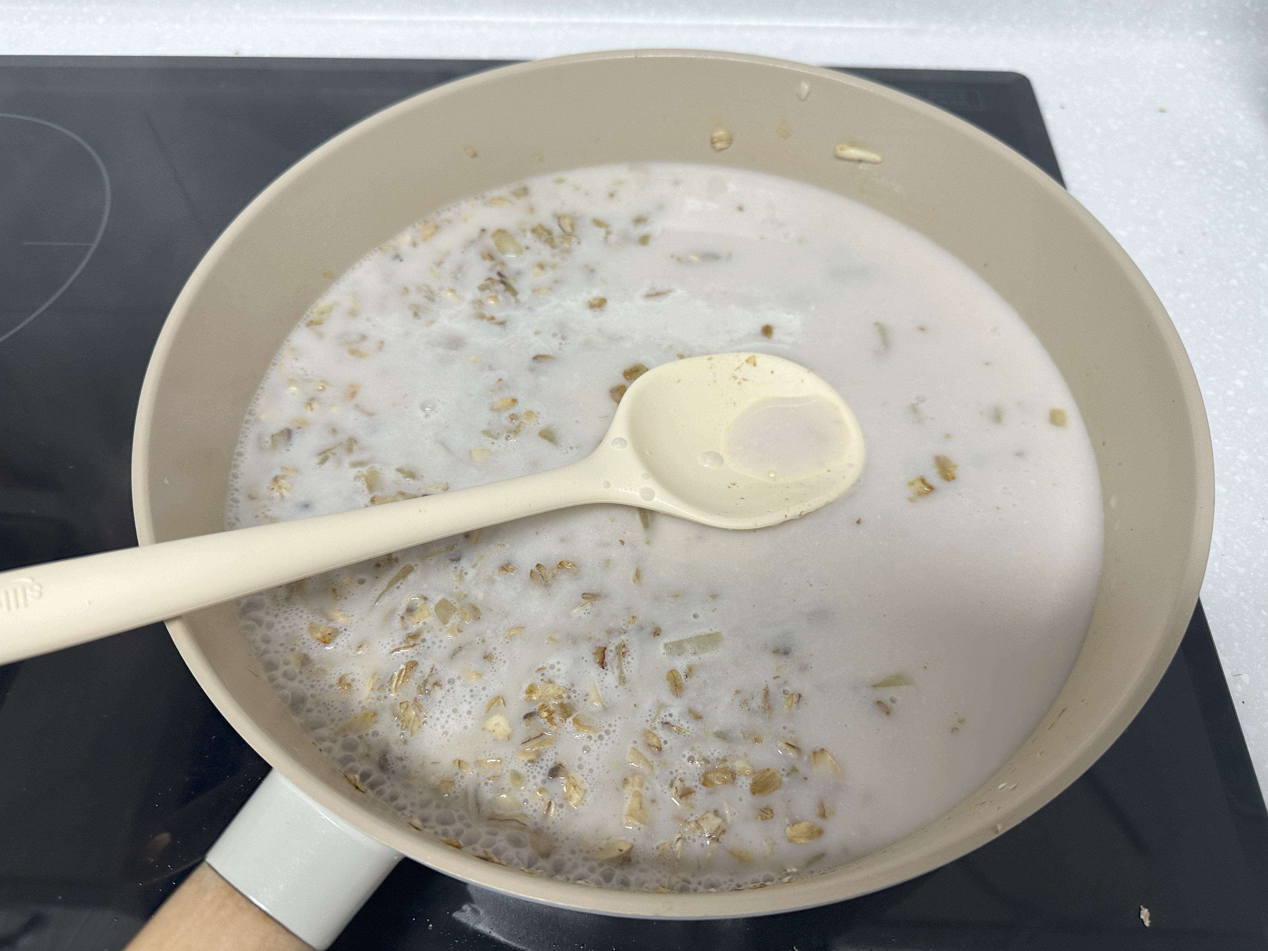 4. 양파가 투명해지면 오트밀을 넣고 함께 살짝 볶아주다가, 아몬드밀크 400ml를 넣어 중불에서 저어주면서 끓인다.