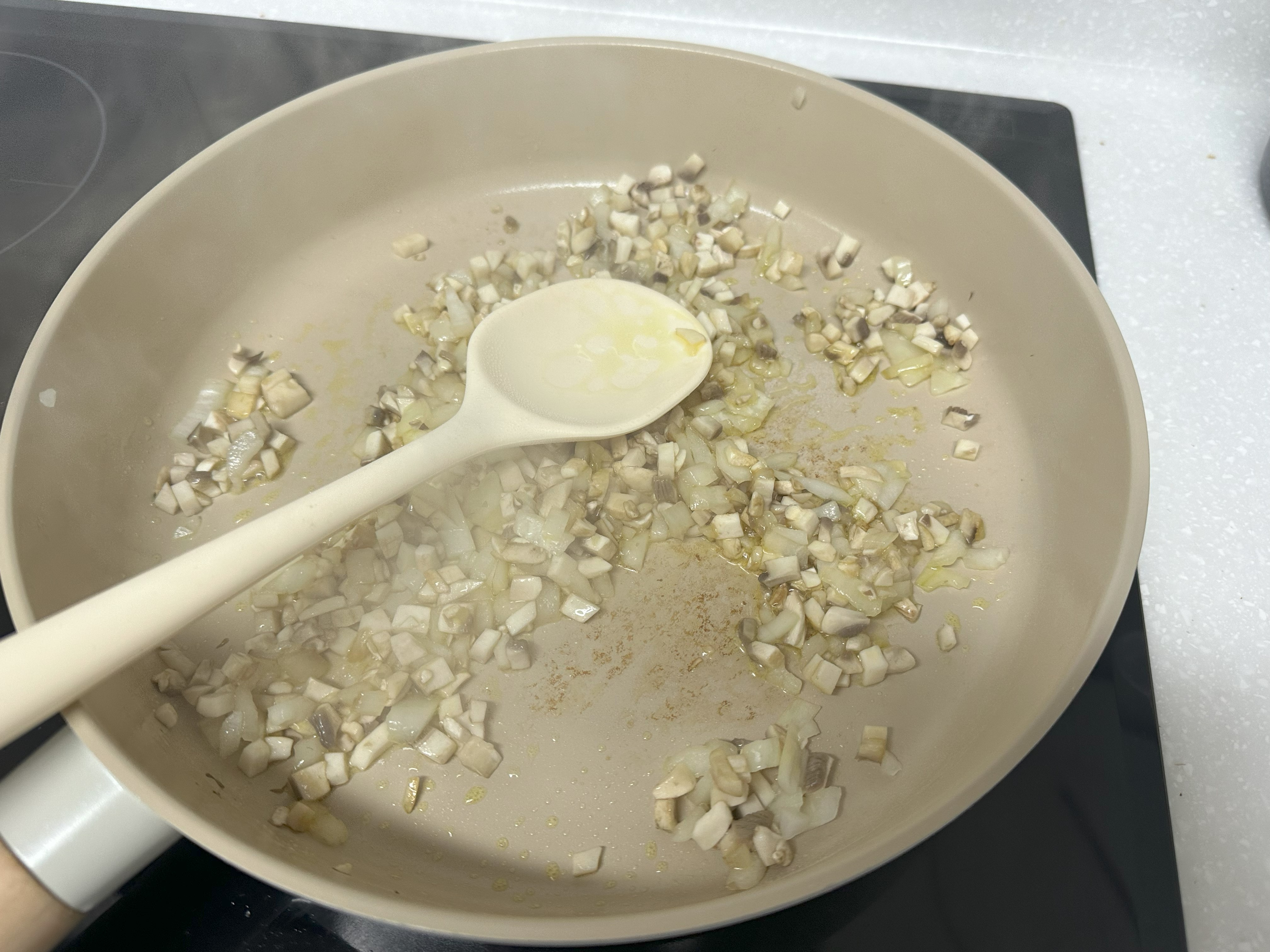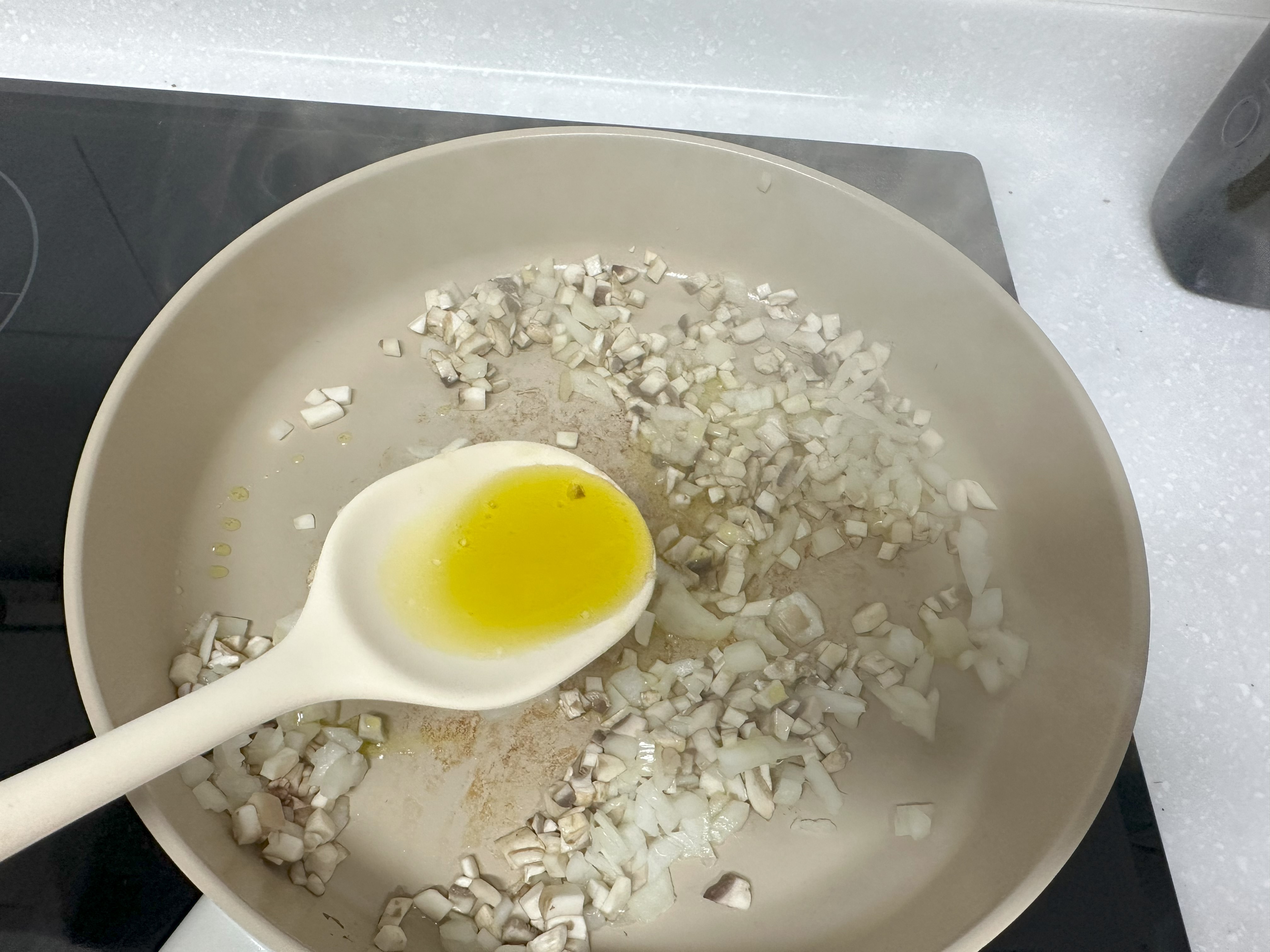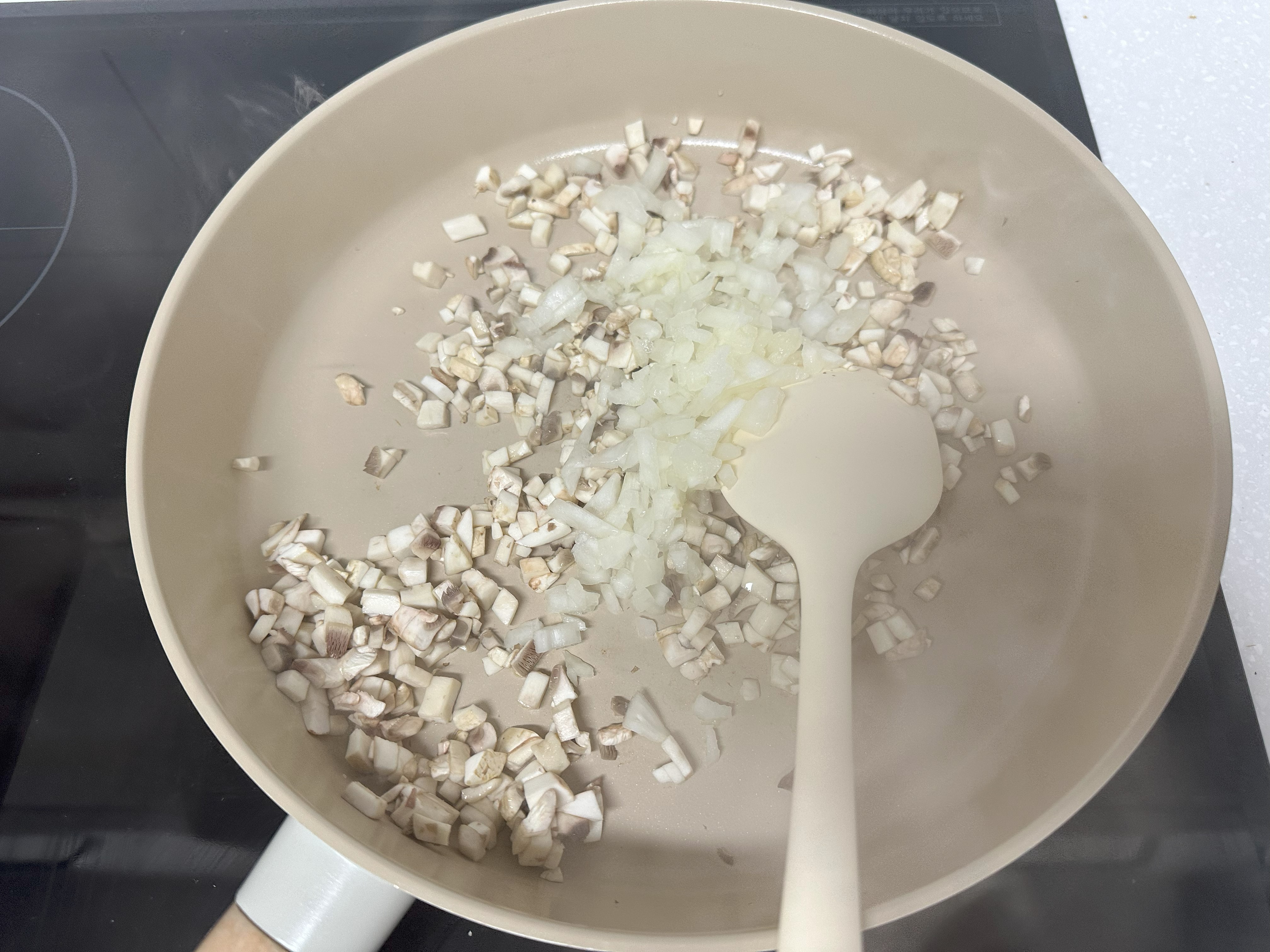 3. 버섯을 볶다가 살짝 수분이 보이면 썰어둔 양파와 올리브유 2큰술을 넣고 투명해질 때까지 볶아준다.
