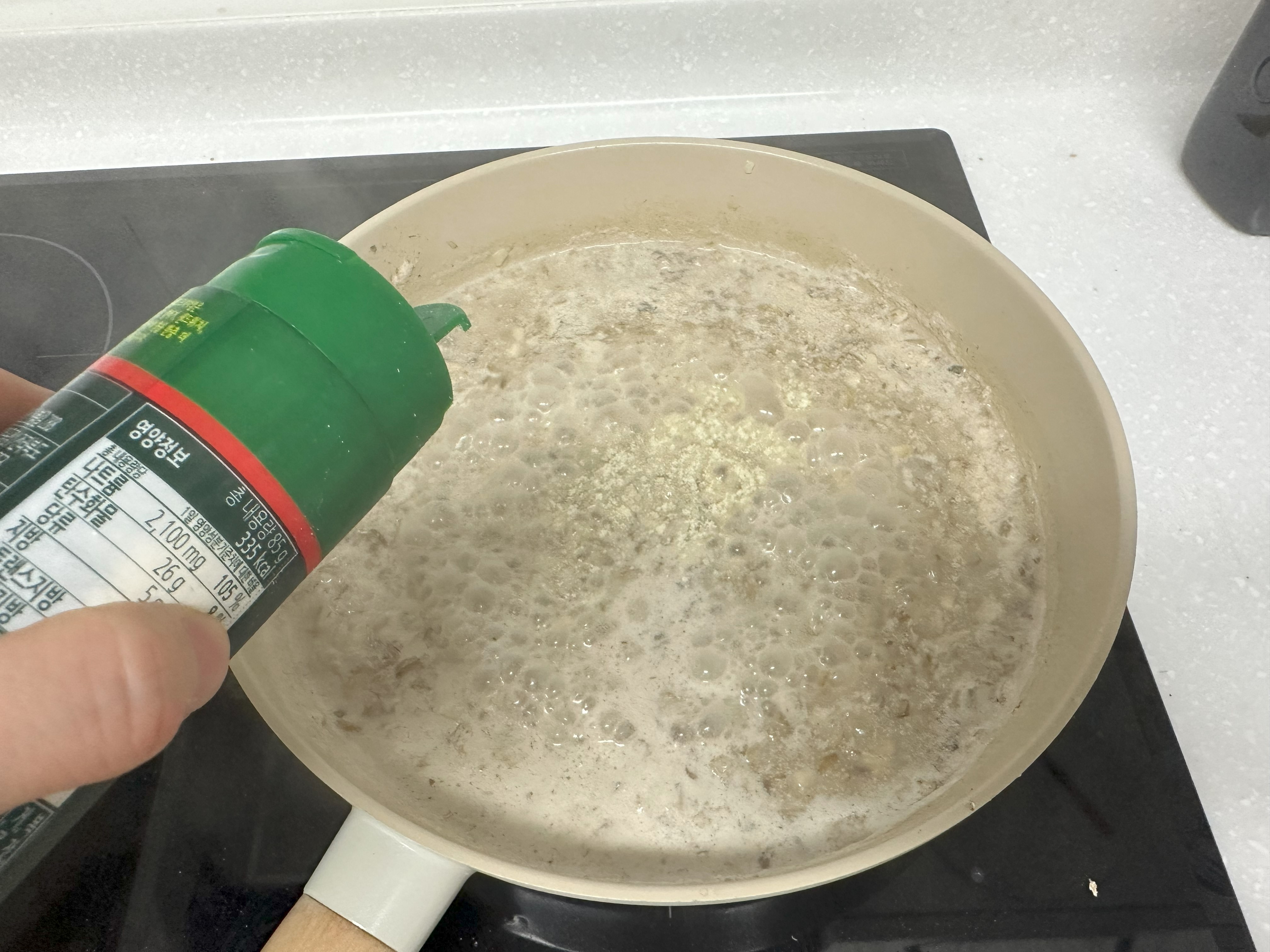 5. 꽃게액젓과 파마산 치즈를 뿌려 간을 맞춰 준다. 꽃게액젓은 참치액으로 대체 가능하다.