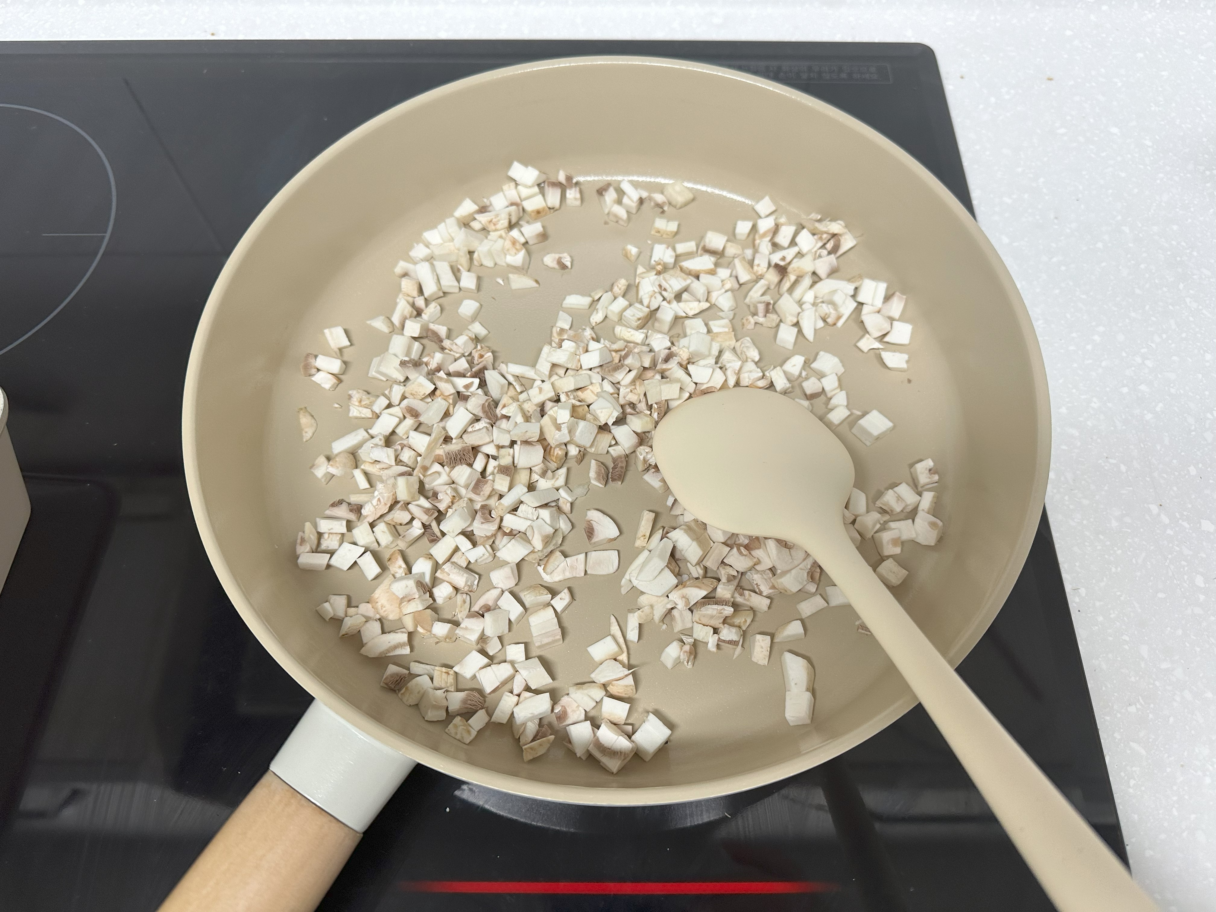 2. 기름을 두르지 않은 마른 팬에 먼저 썰어둔 양송이버섯을 볶아서 버섯 풍미를 올려준다.