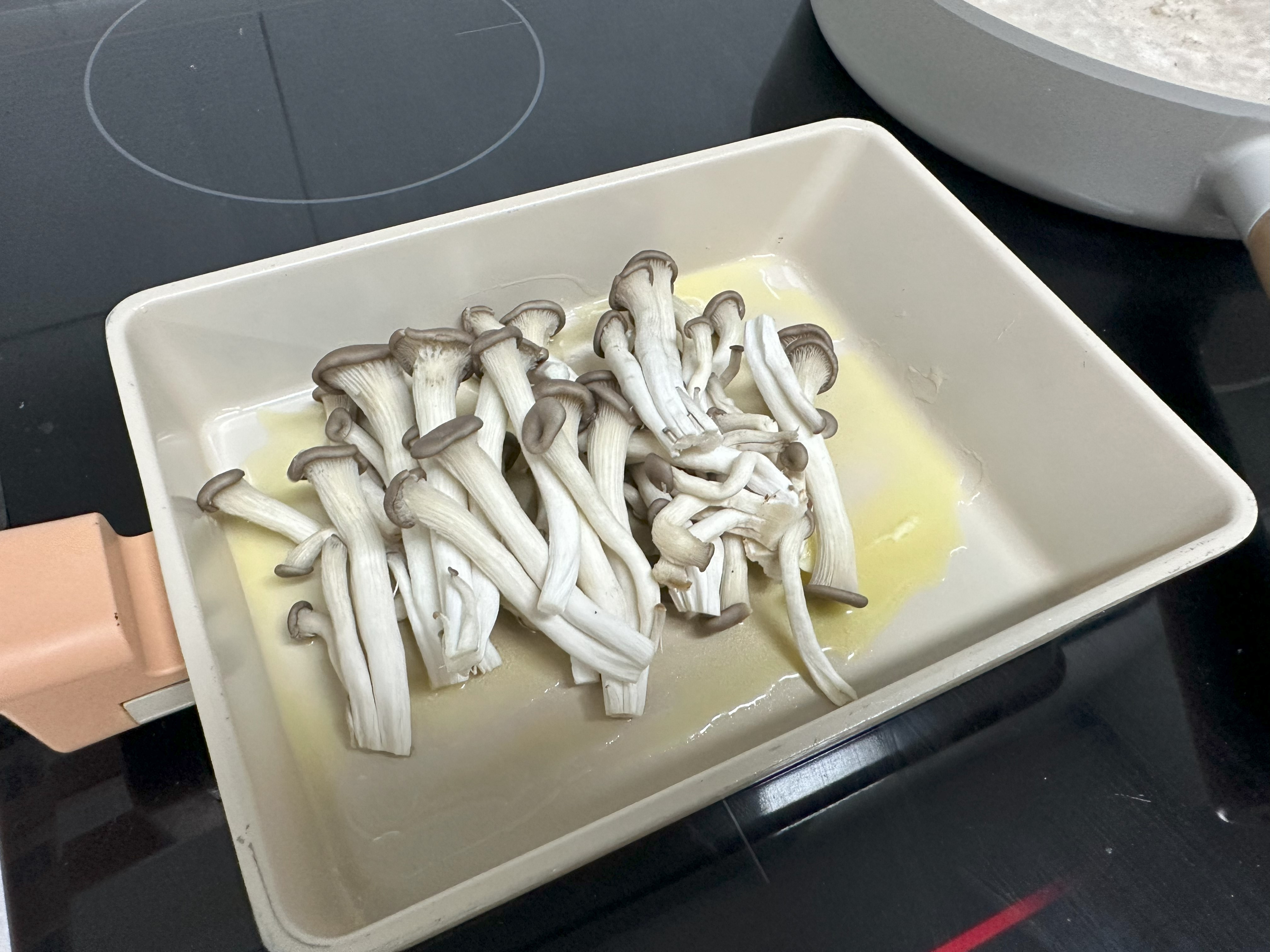 6. 리조또가 끓여지는 동안 고명을 준비하기 위해서 다른 팬에 버터를 한 스푼 녹인 후 느타리버섯(또는 참송이버섯)을 볶아 준다.