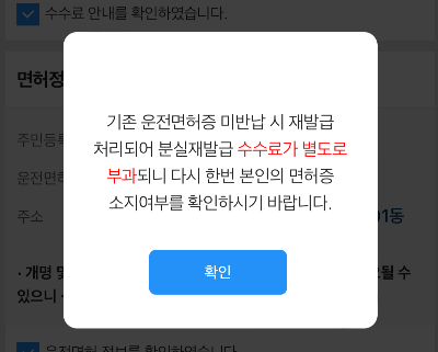 ▽ 면허증 소지하고 있다고 누르면 아래와 같이 확인 메시지가 나오고 확인을 누른다.