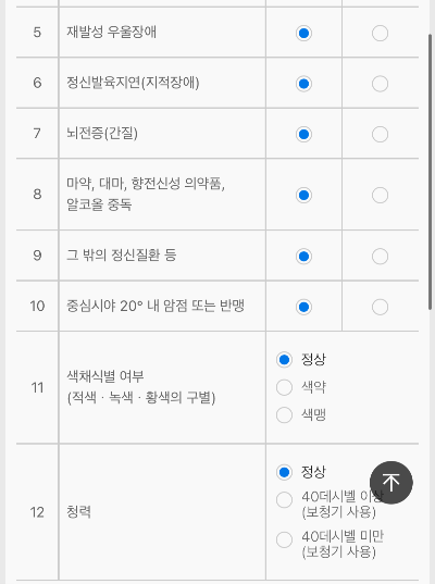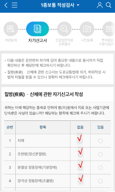 ▽ 아래와 같이 질병, 신체에 관한 자기 신고서를 작성한다. 해당사항이 없으면 모두 없음에 체크를 하면 된다.