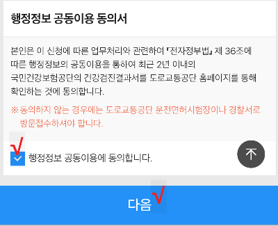 ▽ 그리고 아래로 내려 행정정보 공동이용 동의서에도 체크를 한다. (적성검사를 따로 하지 않고 최근 2년 내의 국가건강검진결과서로 확인하는 것에 동의를 하는 것이다.) 그리고 다음을 눌러 자기신고서 작성하는 페이지로 넘어간다.