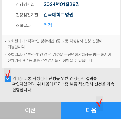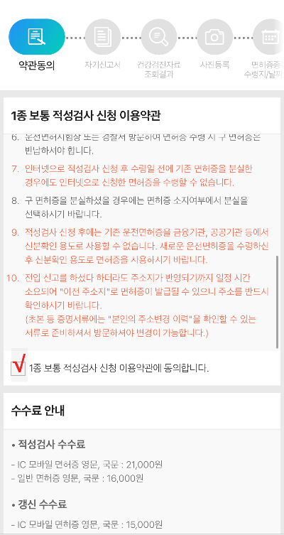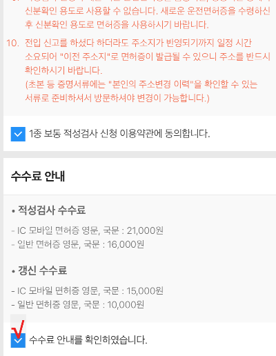 ▽ 아래와 같이 1종 보통 적성검사 신청 이용약관에 동의하기 위해 박스에 체크를 하고, 수수료 안내도 확인 후 체크를 한다.