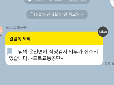 4. 카카오톡에서 운전면허 적성검사 접수 알림 메시지 확인
