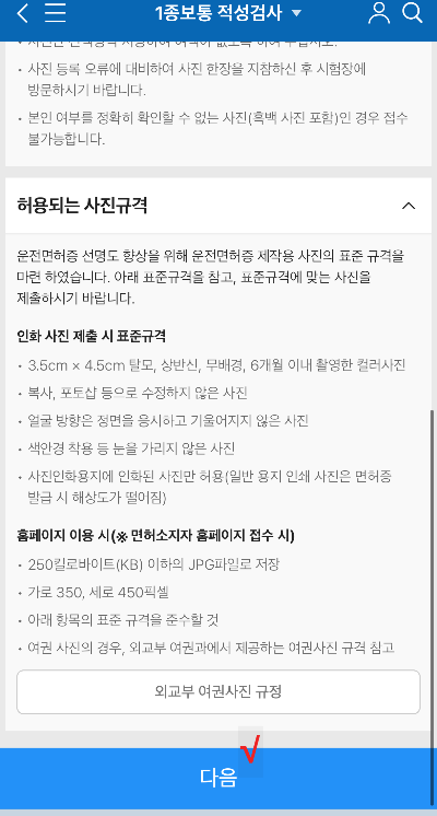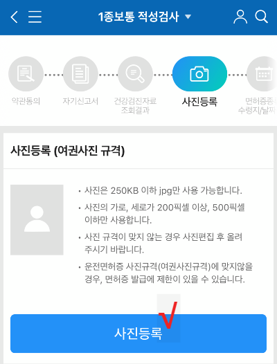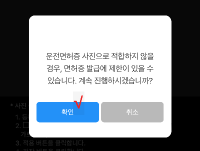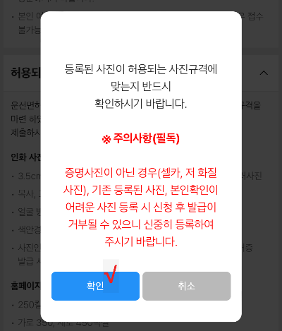 ▽ 사진등록을 눌러 규격에 맞는 사진을 업로드한다. 사진이 규격에 맞지 않으면 면허증 발급에 제한이 있을 수 있어서 주의사항이 뜬다.