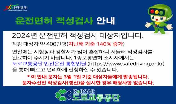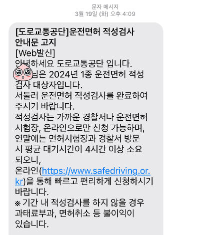1. 도로교통공단으로부터 "운전면허 적성검사 안내문 고지" 문자를 받음