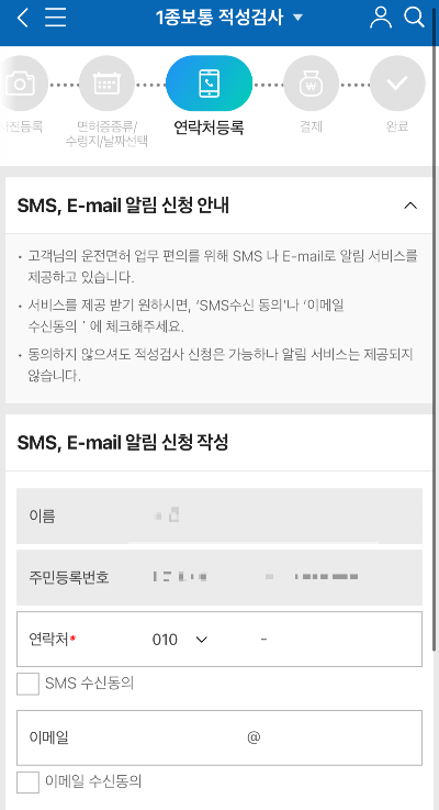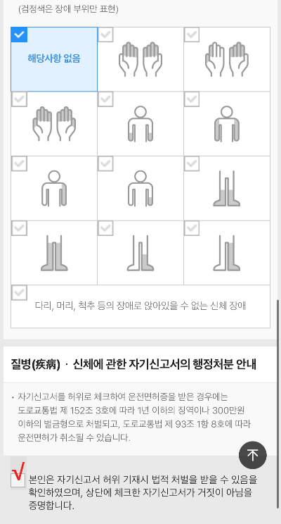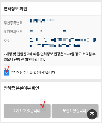 ▽ 더 아래로 내려서 면허 정보를 확인 후 체크하고, 면허증 소지 여부도 선택한다.