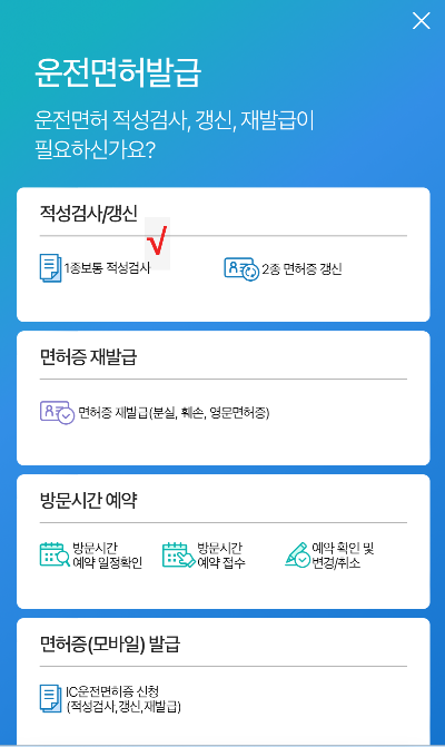 ▽ 그다음, 적성검사/갱신에 있는 "1종보통 적성검사"를 눌러서 들어간다.