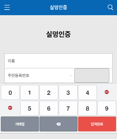 ▽ 그러면 아래와 같은 실명인증 페이지가 나오는데, 이름과 주민등록번호를 넣고 확인을 누른 후 본인이 편하게 사용하는 방법으로 실명인증을 진행한다.