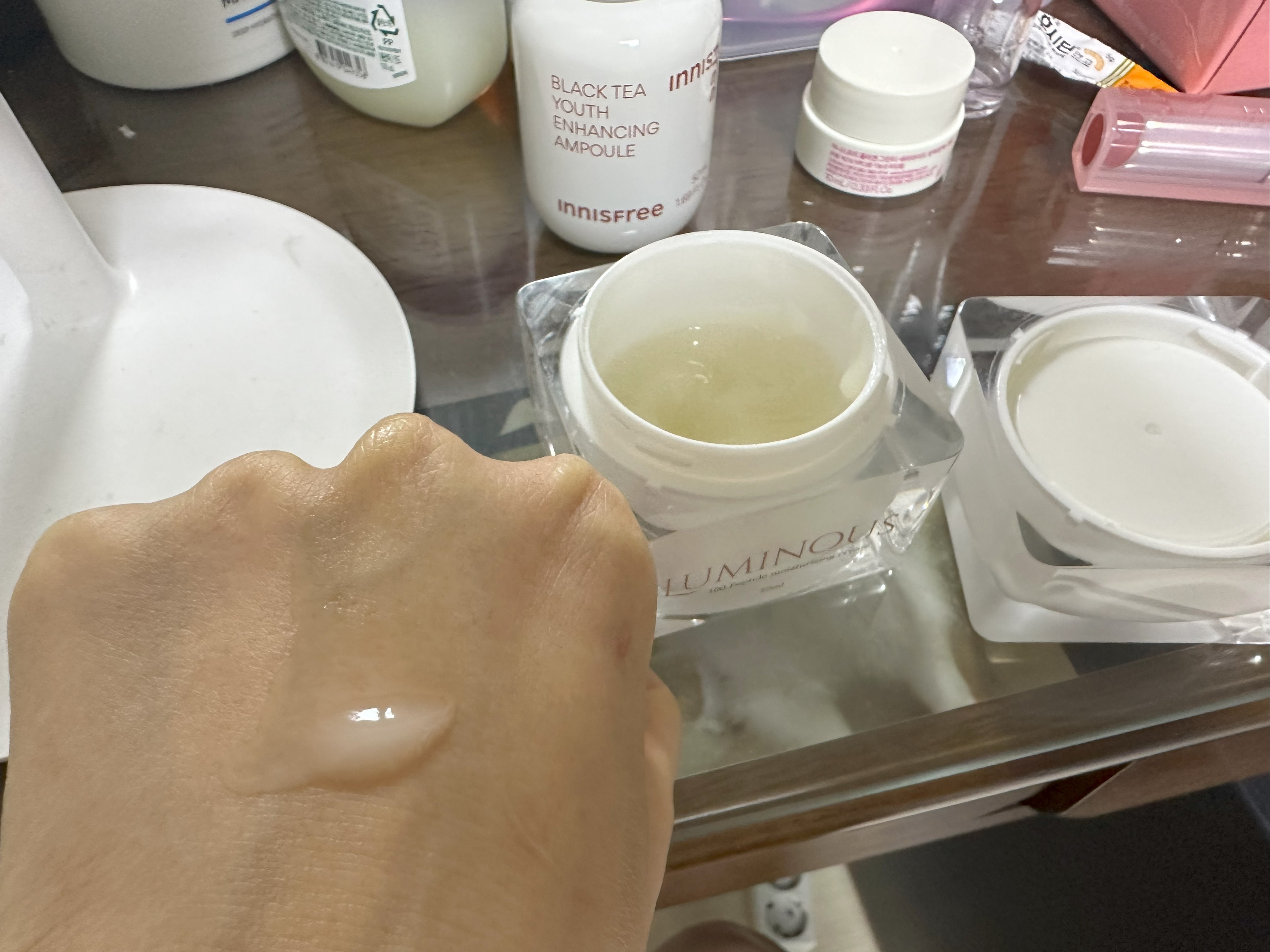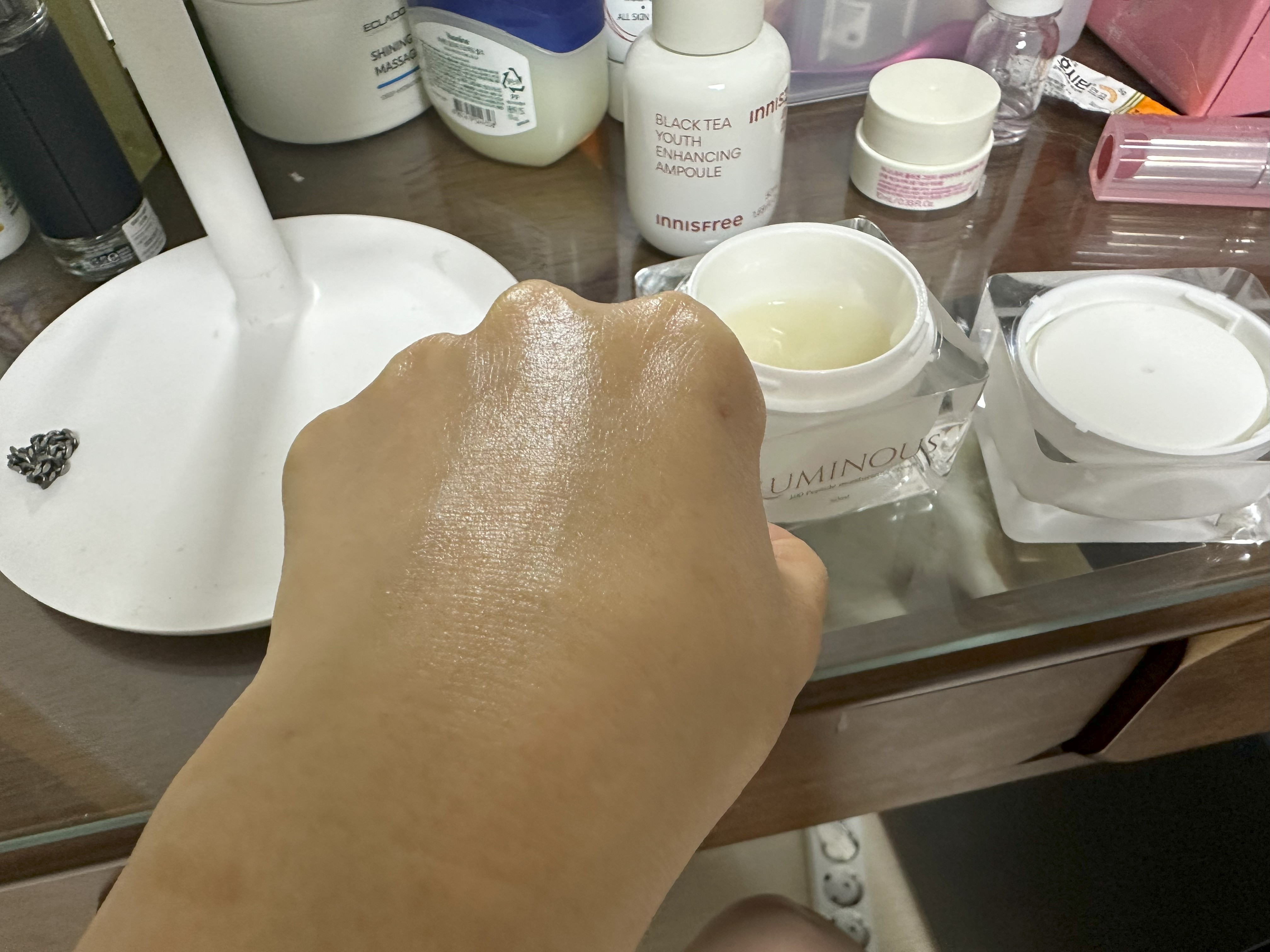 손등에 올리자마자 스르르 펴 발리고, 끈적임은 거의 없고 피부에 광이 돌면서 촉촉하다.